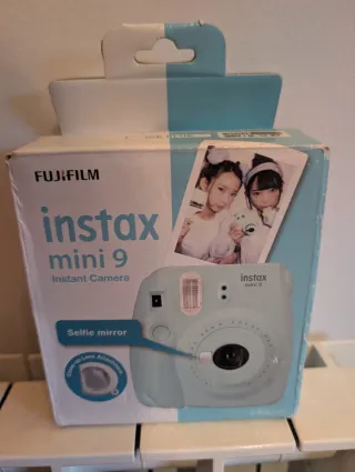 Cámara instantánea Fujifilm Instax Mini 9 en color azul hielo. Ideal para capturar momentos de forma divertida y obtener fotos al instante. - Incluye espejo para selfies. - Incluye accesorio de lente de aproximación. - En perfecto estado. Utilizada una vez