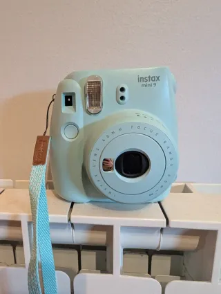 Cámara instantánea Instax Mini 9 en color verde/turquesa Incluye funda (sin cuerda) del mislo color. La cámara tiene un carrete al que le queda 8 fotos (ver foto) Incluye un carrete nuevo de 10 fotos
