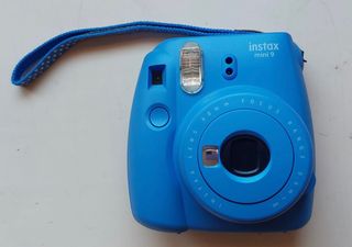 Cámara instantánea Fujifilm Instax Mini 9 en color azul. - Incluye correa para llevarla cómodamente. - Flash integrado para fotos con poca luz. - Lente Instax de 60mm.