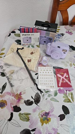 Cámara instantánea, color violeta, nueva sin estrenar, solo abierta para hacerle la foto, trae dos fundas, pegatinas, una tarjeta navideña , se puede entregar en benajarafe o en Málaga capital