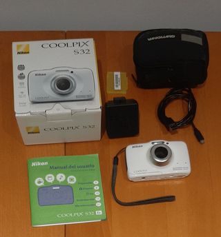 Cámara Nikon Coolpix S32, color blanco. Sensor 13MP, resistente a golpes, polvo y agua (sumergible hasta 10m). En perfecto estado y se incluye todo lo que se ve en las fotos: caja original, instrucciones en español, batería, cable USB (también una funda en correcto estado) . Cámara digital muy fácil de usar (ideal niños)