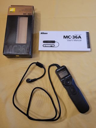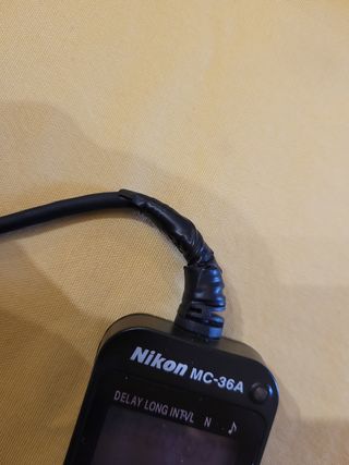 Disparador remoto Nikon MC-36A en buen estado, aunque con un pequeño desperfecto en el cable (ver fotos). Incluye el disparador, el cable y el manual de usuario. - Permite controlar la cámara a distancia. - Funciona con pilas (no incluidas). - Cable con señales de uso, pero funcionamiento perfecto. Perfecto para la nikon d500