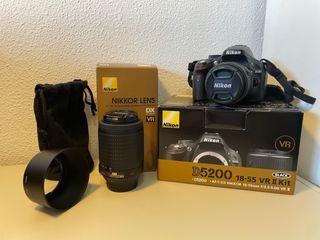 Cámara Reflex Nikon D5200. Nueva, apenas sin uso. 1155 disparos. Conserva la caja original. El pack incluye: - El cuerpo de la cámara - La funda original de Nikon - Un objetivo de 18-55 mm VR - Un objetivo de 55-200 mm VR - La tapadera del objetivo - Una tarjeta de memoria - La batería de la cámara - El cargador de la batería - El cable USB para transferir las fotos al ordenador - Un trípode - Un libro de fotografías originales de Nikon