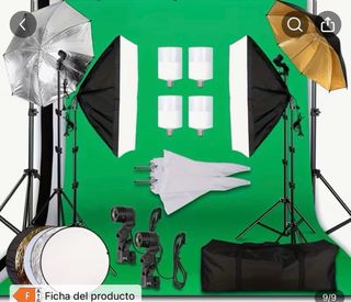 Completo set de estudio fotográfico para crear tus propias producciones. - Fondo verde de tela. - 2 Softbox con paraguas. - 2 Paraguas (uno plateado y otro dorado). - 4 Bombillas de luz. - 2 Luces de flash. - 1 Reflector 5 en 1. - 1 Bolsa de transporte.