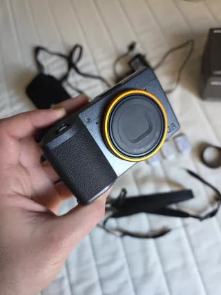 Cámara Ricoh GR III Street Edition. En muy buen estado general, tiene 3800 disparos. La vendo con 3 baterías ORIGINALES de Ricoh. La cámara esta libre de polvo en el sensor, como se puede verificar por la foto del cielo incluída en el anuncio. El kit de venda incluye también: - Tapa de Objectivo JJC; - Funda Rígida de viaje JJC; - Cargador de batería triple JJC; - Tarjeta SD Lexar Profesional 64gb; - Adaptador NiSi para filtros 49mm; - Correa de Cuero Ricoh GS-3; - Funda de Piel Ricoh GC-11; - Anillo de color naranja característico de la edición. Incluye un anillo alternativo en el color de la cámara. Entrega en manos en Gracia