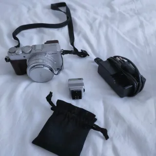 Cámara Panasonic Lumix DMC-LX100 en color plata. Año 2016. Defecto en la pantalla (Leds apagados). Ver foto. Incluye accesorios para su uso: - Correa para el cuello. - Cargador de batería y bateria - Flash. - No incluye tarjeta de memoria. Fotografía profesional Leica retro vinagre foto compacta
