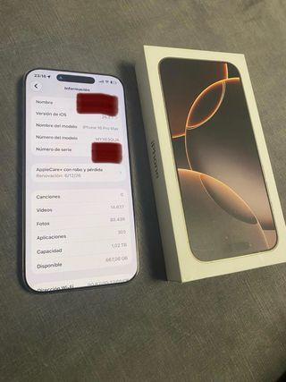 Vendo iPhone 16 Pro Max de 1 TB, en estado impecable, siempre usado con funda y protector, sin golpes ni arañazos (ver fotos reales).Terminal muy cuidado, funcionamiento perfecto, ideal para quien busca máxima capacidad, potencia y cámara profesional sin preocuparse por espacio ni garantías. ⸻ 🔹 Detalles técnicos • 📱 Modelo: iPhone 16 Pro Max • 💾 Capacidad: 1 TB • 🎨 Color: Titanio claro / Natural • 🧠 iOS actualizado • 🔋 Batería en muy buen estado • 🔐 AppleCare+ con robo y pérdida activo (hasta dic2026) Incluye ✅ iPhone 16 Pro Max ✅ Funda MagSafe (la de las fotos) ✅ Caja original ✅ AppleCare+ activo ✅ Se entrega restaurado