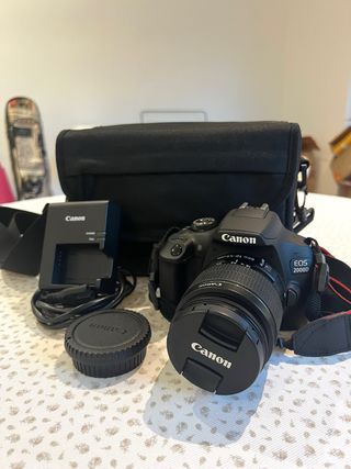 Cámara réflex digital Canon EOS 2000D en color negro. Se encuentra en excelente estado, como nueva. Es un modelo ideal para iniciación, por el precio que tiene, cuenta con controles intuitivos y función wifi para pasar rápidamente las fotos al movil. Se incluye: - Cuerpo de la cámara con su correa - Objetivo Canon EF-S 18-55mm IS II (con estabilizador) - Cargador y bateria original. - Bolsa de transporte.