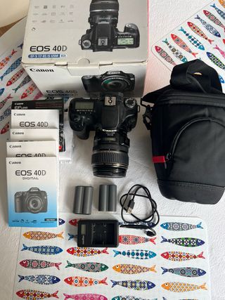 Cámara réflex digital Canon EOS 40D con objetivo 17-85mm. Aunque tiene evidentes marcas de uso, la cámara funciona perfectamente, viene con todo lo que se ve en las fotos. - Cuerpo de cámara Canon EOS 40D. - Objetivo Canon EF-S 17-85mm IS USM. - Baterías. - Cargador de batería. - Correa. - Bolsa de transporte. - Caja y documentación