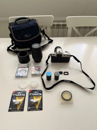 Cámara fotgráfic Reflex Nikon F60 analógica. Incluye 2 objetivos, mochila y otros accesorios fotograficos.