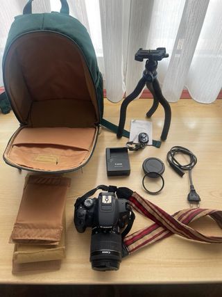 *Pack Fotografía Canon EOS 700D + Accesorios Completo* Vendo un completo kit de fotografía ideal para principiantes y entusiastas, en perfecto estado, que incluye: - Cámara Canon EOS 700D con objetivo Canon 18-55mm. - Incluye una correa original Canon con funda de tela cosida a mano para mayor seguridad y evitar robos. - Tarjeta SD ADATA de 64GB, perfecta para almacenar todas tus fotos y videos. - Cargador original Canon y una batería. - Filtro protector de lente B+W de alta calidad. - Trípode Octopus flexible, usado solo una vez, con mando a distancia compatible con iOS y Android (funciona con pila de botón). - Mochila modulable e