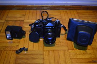 Cámara réflex analógica Zenit 12XP en muy buen estado de conservación. Incluye objetivo original, tapa frontal, flash externo, funda de transporte y cable/cargador. Cámara totalmente mecánica, ideal para fotografía analógica y para coleccionistas. El cuerpo y el objetivo se encuentran bien cuidados, sin golpes visibles. Perfecta para quienes buscan una cámara clásica de 35 mm con manejo manual y estética vintage. Se entrega tal como se ve en las fotos.