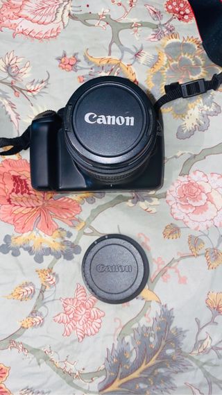 Cámara de fotos profesional Canon en color negro. - Diseño ergonómico. - Pantalla LCD. - Correa de sujeción. - 10 megapixeles de sensor - enfoque automático de 9 puntos para garantizar que las fotos no salgan desenfocadas, - grabación de vídeo en Full HD, con una gran definición y calidad de imagen - pantalla LCD de 3 pulgadas - cuenta con wifi y bluetooth - con funda marca Supreme tiene 8 compartimentos para guardar lo necesario para el trasporte del equipo fotográfico. como cable cargador de batería, tarjetas de memoria, tapa de la cámara etc. impermeable y con correa ajustable para el trasporte, en color azul y gris