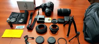 Cámara que posee dos viajes y guardada en su funda con todos los extras desde su último uso. Fue un capricho muy caro que ahora vendo por no haberla usado. No especifico como nueva porque no la compré ayer pero, créanme que podría decirse que está como NUEVA. Tiene todo tipo de extras (de nuevo, mi capricho). Incluye manual de uso oficial y otro de tapa blanda (en inglés) que compré, además de todo tipo de lentes y dos objetivos (en caja sin uso) + tarjeta memoria. Si desean más información, por favor, no duden en preguntar. Todo lo que está en fotos se incluye en la venta. Más info sobre sus características en la web de Canon.