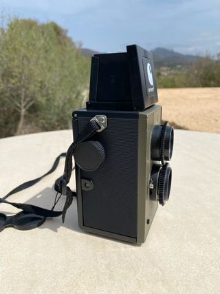 Cámara réflex de doble lente con avance de perilla que produce 12 exposiciones de 4x4 cm en una película tipo 127. Formato cuadrado. En buen estado de conservación como se puede ver en las fotos.
