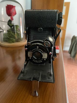 cámara de la imagen es una Kershaw Eight-20 Penguin. Es una cámara plegable vertical para película en rollo de 120, fabricada en Inglaterra a principios de la década de 1950. Diseñada para fotografía amateur básica, utiliza un formato de negativo de 6x9 cm. Cuenta con velocidades de obturación "Instant" y "B", y enfoque desde 1,80 metros hasta infinito. Su construcción es robusta, principalmente de acero fundido con un fuelle desplegable