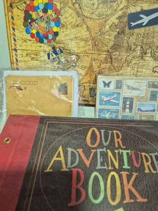 Álbum de fotos con temática de viajes y aventuras, titulado Our Adventure Book. - Diseño de tapa imitando cuero. - Decoración con mapa del mundo y elementos de viaje. - Incluye un pequeño globo aerostático decorativo. Hago envíos o entrego en Alicante, zona pla de la vallonga, no me desplazo