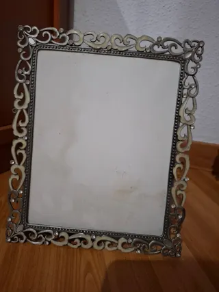 Elegante marco para fotografías con un diseño ornamental. Solo le falta el cristal. - Marco de metal con detalles en relieve. - Adornos en forma de volutas y pequeñas incrustaciones. - Acabado en color plata y crema.