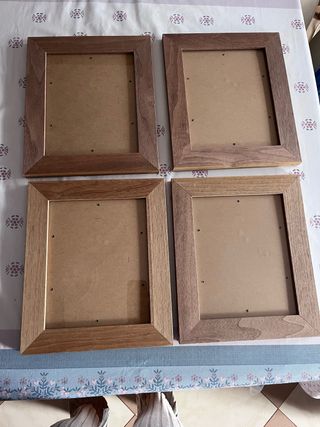Set de cuatro marcos de fotos de madera, perfectos para tus recuerdos. El tamaño interior (para la foto) es de 20x25 cm y con el marco incluido la medida es de 27x32 cm. - Material: Madera. - Color: Tono marrón simulando betas de madera. - Excelente calidad y resistencia. Se puede colgar (en vertical u horizontal) o poner apoyado encima de algún mueble, ya que tiene ambas maneras de colocarlo.