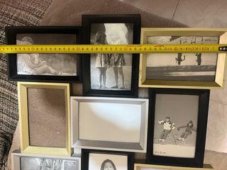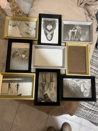 Conjunto de nueve marcos de fotos de diferentes tamaños y colores. - Marcos de color dorado, negro y plateado. - Incluye marcos para fotos de 10x15 cm.