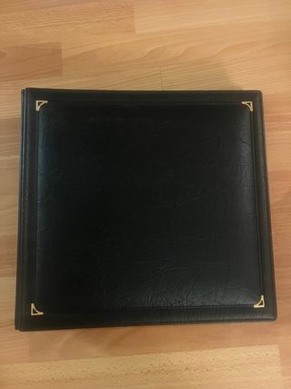 Elegante álbum de fotos con cubierta negra y detalles metálicos dorados en las esquinas. - Material: Polipiel. - Color: Negro. - Diseño: Clásico con esquinas reforzadas. -40 paginas