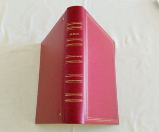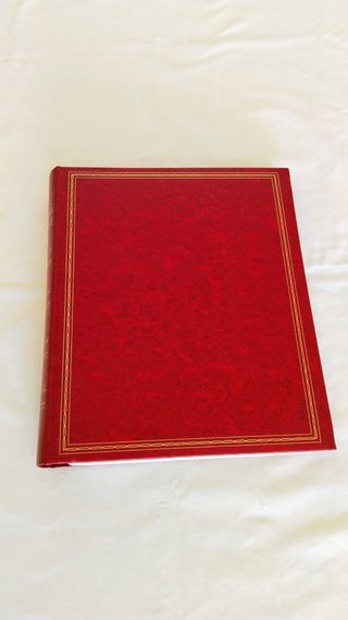 Elegante álbum de fotos con capacidad para 300 fotografías de tamaño 10x15 cm. - Cubierta de color rojo con textura. - Detalles dorados en las esquinas y el lomo.