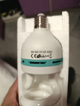 Bombilla de bajo consumo para fotografía o iluminación general. - Potencia: 85W - Temperatura de color: 5500K - Voltaje: 220V-240V - Frecuencia: 50/60Hz - Certificaciones: CE, GS, EMC, RoHS