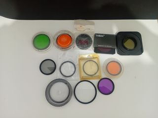 Lote de varios filtros para cámaras de fotografía. - Filtro verde - Filtro naranja - Filtro ARRI - Filtro con adaptador - Filtro amarillo - Filtro naranja - Filtro de densidad neutra - Anillo adaptador - Filtro morado
