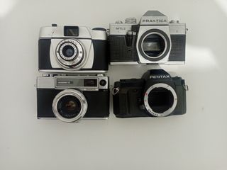 Se vende lote de 4 cámaras de fotos antiguas, ideales para piezas o para coleccionistas. - Cámaras de las marcas Pentax, Praktica y Yashica. - Modelos variados. - Para reparar o para aprovechar componentes.