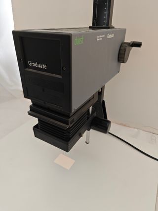 Ampliadora graduada en blanco y negro Durst con kit de formato de 35 mm que incluye condensador y soporte de neg sin vidrio de 35 mm. y lente Schneider de 50 mm. una ampliadora de serie amateur/educativa de las décadas de 1980 y 1990, preparada para imprimir formatos negativos de 35 mm. muy popular en las escuelas y universidades, por lo que si aprendió a imprimir en la escuela o la universidad en la década de 1990 / 2000, ¡probablemente haya usado este tipo de ampliadora antes! panel y una lente de 50 mm f3.5 con solo marcas mínimas como se muestra, y en perfectas condiciones de funcionamiento. esta ampliadora está preparada