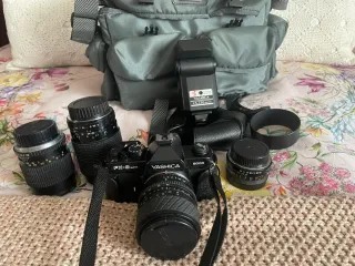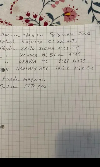 Conjunto de cámara analógica Yashica FX-3 Super 2000 con accesorios. - Incluye cámara Yashica FX-3 Super 2000. - Flash Yashica CS-220 AUTO. - Cuatro objetivos adicionales. - Parasol. - Funda y Correa para cámara. - Bolsa de transporte Fotopro.
