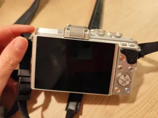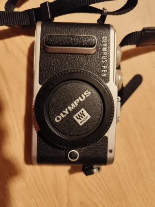 Cámara Olympus Pen E-PL8 en color plata. Un diseño elegante y compacto para capturar tus momentos. - Cuerpo metálico. - Acabado texturizado. - Incluye: correa de sujeción, batería, cargador de batería, flash con su funda, cable para conectar con el ordenador, y funda de la cámara (está sí que tiene alguna marca como bien se aprecia en la foto)..