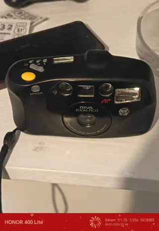 Cámara de fotos analógica Minolta Riva Zoom Pico. - Zoom óptico de 38-60 mm. - Flash integrado. - Pantalla LCD.