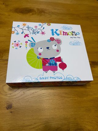 Álbum de fotos con un diseño inspirado en el kimono, perfecto para guardar los recuerdos más especiales. - Ilustración de un tierno osito con kimono. - Motivos florales y nubes decorativas. - Título Kimono y Baby Photos.
