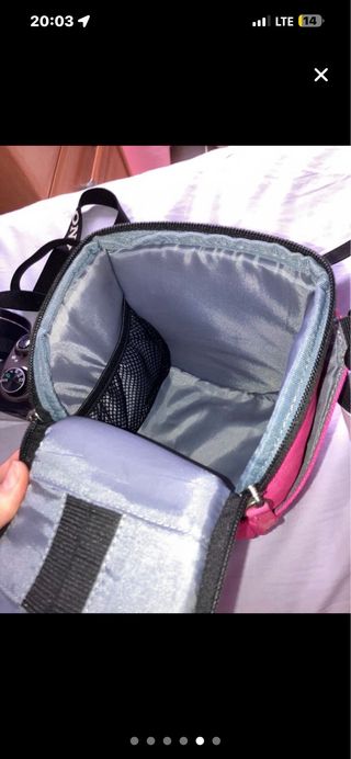 Funda para guardar y proteger tu cámara de fotos. Es de color rosa y tiene una correa negra. - Material resistente. - Cierre de cremallera. - Correa ajustable. - Compartimentos para guardar cosas.