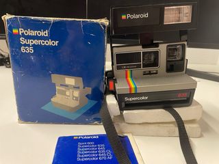 Cámara fotográfica POLAROID, modelo SUPERCOLOR 635, de los años 80. En perfecto estado. Con su caja y manual de instrucciones originales.