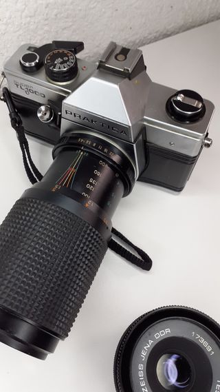 Camara de fotos Pentacon Praktica súper TL 1000 con dos objetivos, uno Rokinon 1:4.5 200m t 80-200mm 52 diam.Otra Carl Zeiss Jena Tessar 2,8/50.Todo funciona.Envio si