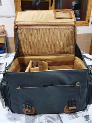 Bolsa de transporte profesional para cámara de fotos Tiene muhcos compartimentos y bolsillos, es acolchada e Mide unos 10cm de ancho x 15cm de alto y 13cm de fondo aproximadamente.