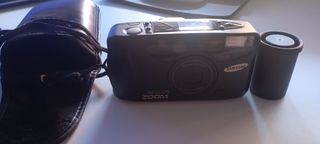 Cámara de fotos analógica Minolta, modelo de principios de los 2000. Ideal para coleccionistas o para quienes disfrutan de la fotografía con carrete. - Diseño clásico en plata y negro. - Mecanismos internos visibles para carga de película.