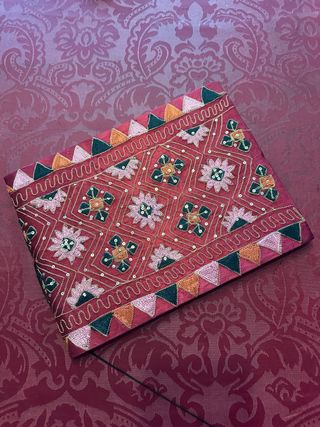 Álbum para guardar tus fotos y recuerdos más preciados. Su cubierta está adornada con un intrincado bordado. Original años 80. No sabemos qué marca es, hemos puesto esa porque nos obligaba a elegir una marca. - Diseño con motivos florales y geométricos. - Detalles de lentejuelas y abalorios. - Borde decorativo con zig-zag y triángulos.