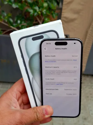 Teléfono móvil iPhone 15 en acabado negro/gris. - Diseño elegante y moderno. - Cámara dual en la parte trasera. - 87% de salud de bateria - Pequeña ralladura en la esquina (3ra foto) - Tengo cargador original