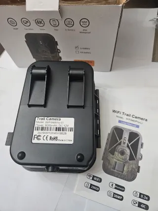 Cámara de vigilancia para exteriores con conexión WiFi. Ideal para la caza y la observación de fauna. NO TIENE BATERIA. - Resolución de video 4K. - Captura de fotos de 36MP. - Resistencia al agua y al polvo IP65. - Batería recargable de 8000mAh. - Soporta tarjetas de memoria de hasta 256GB. - Conectividad Bluetooth. C122