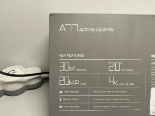 Cámara de acción APEMAN A77 en color gris. Ideal para capturar tus aventuras. - Sumergible hasta 30 metros. - Pantalla LCD de 2.0 pulgadas. - Resolución de video 4K Ultra HD. - Captura fotos de 20MP. - Temporizador de disparo. - Control remoto. - Grabación en bucle.