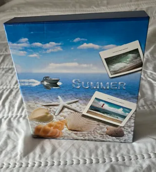Álbum de fotos con un diseño veraniego y marino. Perfecto para guardar tus recuerdos. - Diseño de playa con conchas y estrellas de mar. - Incluye dos fotos insertadas con escenas de mar y faro. - Detalle de la palabra SUMMER en relieve.
