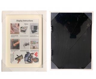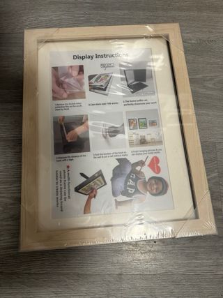 A Marco de fotos de madera con instrucciones de uso incluidas. - Medidas dentro: 28cm x 21cm. - Incluye instrucciones para colgar y mostrar tus obras. - Permite almacenar más de 100 trabajos. - Se puede usar como tablero de dibujo.