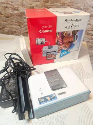 Impresora de fotos compacta Canon SELPHY CP510, ideal para imprimir tus recuerdos al instante. Incluye la impresora, el adaptador de corriente y cables. - Diseño compacto y ligero. - Fácil de usar con indicadores claros. - En perfecto estado.