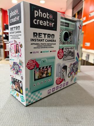 Cámara instantánea infantil Photo Creator, modelo Retro. - Pantalla grande de 3 pulgadas. - Incluye +250 fotos extra. - Funciones: Selfie, Instant, Video. - Edad recomendada: 8+. - Incluye rollos de papel Con Garantía Tienda T-locompro C/Mostoles 38 FuenlabradaMadrid +info 919471850
