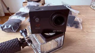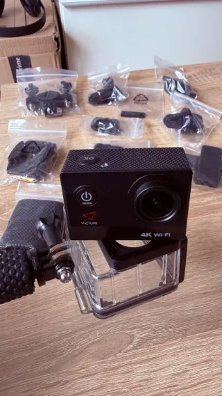 Cámara deportiva Victure 4K con conexión WiFi, ideal para capturar tus aventuras. Incluye un completo kit de accesorios para montarla en diversas superficies. Solo un uso. Incluye carcasa sumergible y kit completo de accesorios originales (soportes para casco/bici, agarres, anclajes, etc.), como se ve en las fotos. - Resolución de vídeo 4K. - Conectividad Wi-Fi. - Pantalla integrada. - Incluye múltiples soportes y adaptadores.