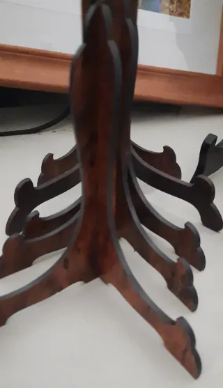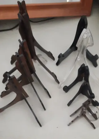 Lote de soportes para fotos y marcos. Incluye varios modelos y tamaños. - Soportes de madera oscura. - Soportes de plástico transparente y negro. - Ideal para exposiciones o decoración.