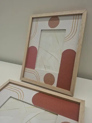 Set de dos marcos de fotos con diseño moderno, colores tierra, de madera clara. Tamaño para foto: 10x15 cm.